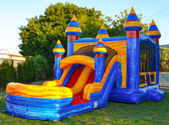 The Melting Arctic Dual Lane Combo combines a roomy bounce surface with a thrilling slide. The inflated landing cushions every ride. Durable vinyl resists wear. High-visibility colors attract attention at events. Non-slip materials on steps and entry points improve safety. The built-in basketball hoop extends play value beyond sliding and bouncing. This unit also features a crawl through shade tunnel.