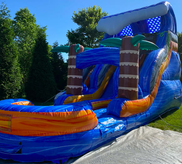 The 18' Blue Plummet Dual Lane Slide is a tropical oasis. This slide offers an easy climb to the top and a fast slip and dip slide to the splash zone at the bottom. Best when used as a waterslide.